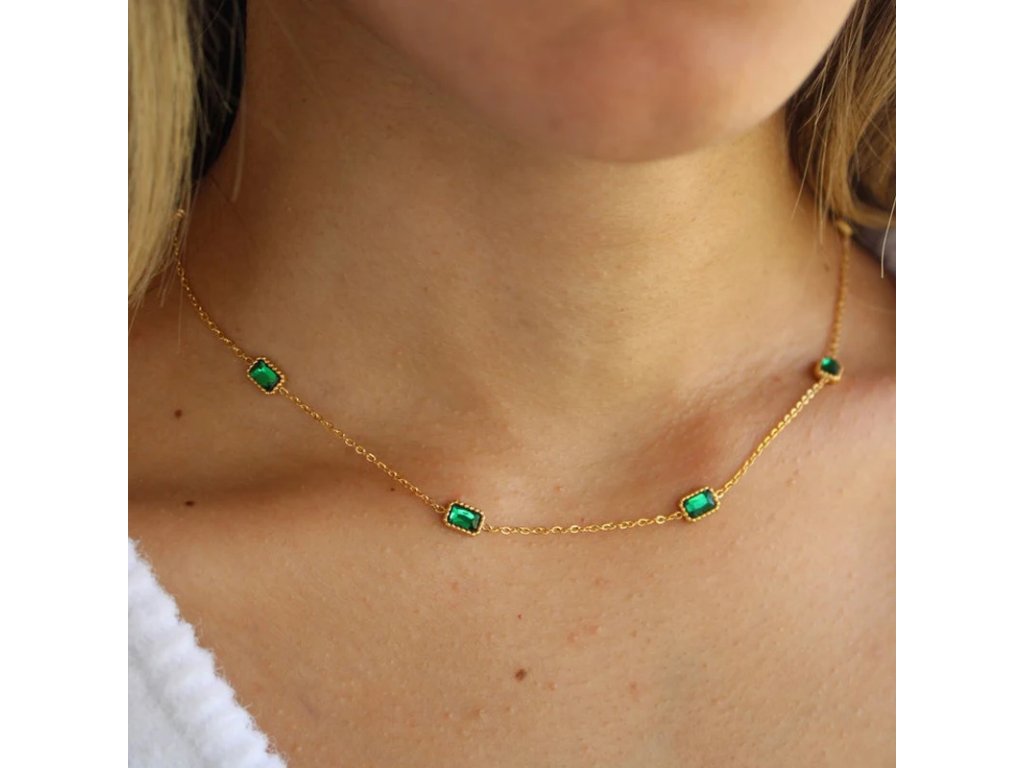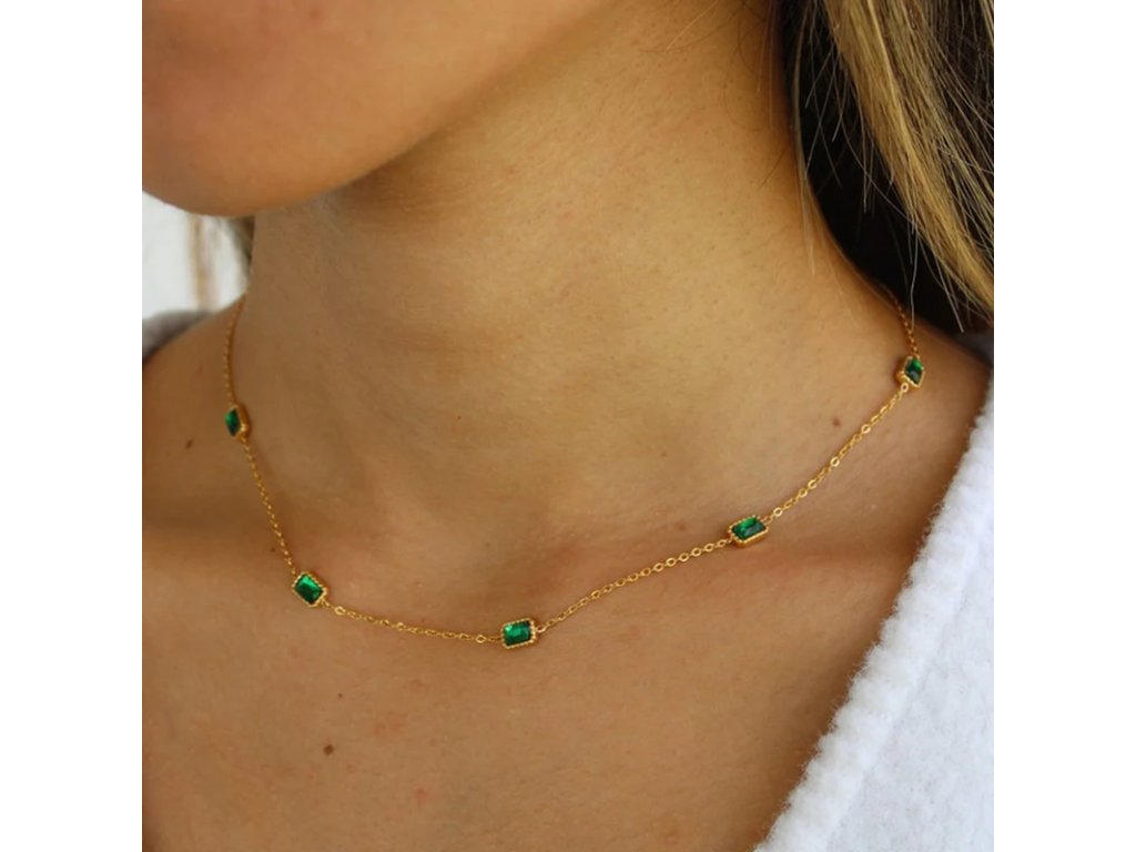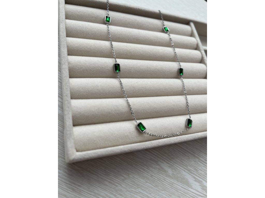 Jemný dámsky náhrdelník v striebornom prevedení, ozdobený kryštálmi v smaragdovej farbe.